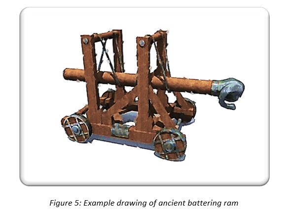 A battering ram was first used in ancient times as a siege engine style weapon that was simple in its design but devastating effective at breaking open the masonry walls or wooden gates of fortifications. It was constructed from a large, heavy log carried mounted into a frame which was able to swing as a pendulum and move on wheels. The weight of the heavy log was propelled by several people with a swinging and forwarding force against an obstacle which would be subject to these combined, massive forces.