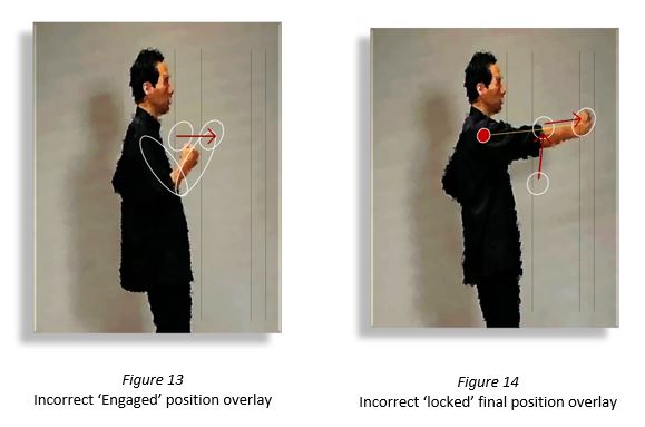 This means that it is not possible to achieve the ‘biting point’ as the forwarding pressure is no longer from under the heavy elbow projecting diagonally up the length of the forearm forwards, towards the opponent. Instead, as shown in Figure 12 above, the elbow is lifted from the shoulder pressing in a straight line horizontally.