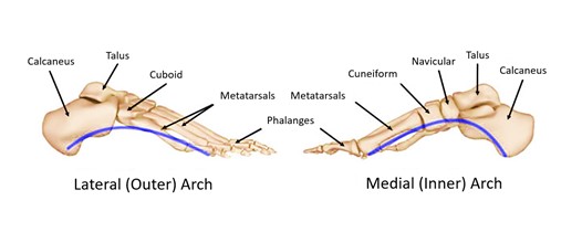 The collective function of these three arches in the foot is to provide a spring action, bearing the weight of the body and absorbing the shock that is produced through dynamic movement. This flexibility conferred by the arches facilitates everyday locomotive functions such as walking and running. This spring-like effect of the arches results in saving metabolic energy through a passive-elastic action that would otherwise be done by active muscle.