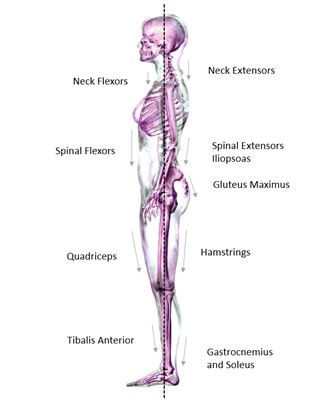 In Kinesiology, 1970 Logan and McKinney termed the muscles that are most active in resisting the force of gravity the ‘anti-gravity muscles’. The main anti-gravity muscles are shown in the diagram below.