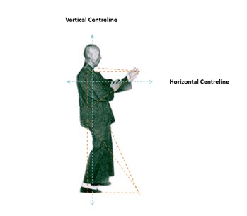 In the relaxed, correct structure the practitioner is able to ‘sink’ in the Lok Ma under the forces of gravity, which in turn rotates the pelvis and secures the upper-body and lower-body through Tei Gong and the straightening of the back (Ting Yui, Ting Bok). From this solid lower triangle joined with the upper triangle the practitioner is then able to extend their arms through the correct application outwards through Mann Sau / Wu Sau to form a triangle in the arms. This structure is shown overlaid on Grandmaster Ip Man in the diagram below, along with markings for the horizontal and vertical centrelines.