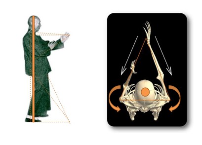 On the left we see Grandmaster Ip Man with the upper and lower body triangulation mapped against his structure in Yee Gee Kim Yeung Ma, with his Mann Sau / Wu Sau arms extended. This image also visualises the vertical core running through the centre of his head, body, and legs. The upper body / arm triangulation and tip of the vertical core are also shown in the diagram on the right.