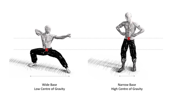 The character on the left has a much more stable stance than the one on the right. This character has a much lower centre of gravity. Within the context of a martial art this means being able to have created a strong platform from which to attack an opponent, whilst also being able to receive an attack without being knocked over.