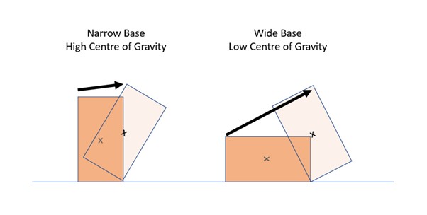 In its simplest form, balance is achieved through the relationship of the base of an object and its centre of gravity. The narrower the base of an object is, the higher its centre of gravity will be. This results in less stability – where the object is easier to be toppled over. Conversely, the wider the base of an object is, the lower its centre of gravity will be. This results in greater stability – where the object is harder to topple over. As such, the most stable objects have wide bases and low centres of gravity. This concept is shown in the model below.