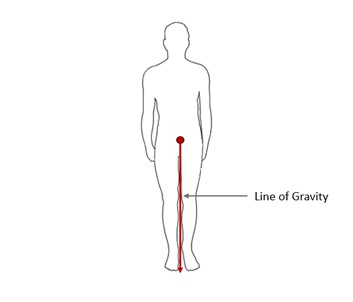 The line of gravity is an imaginary vertical line from the centre of gravity to the ground or surface the object or person is on. It is the direction that gravity is acting upon the person or object. In the anatomical position during normal standing the line of gravity is between the legs and feet right under the person. In the diagram you can see the line of gravity in red going down to the ground from the centre of gravity, indicating the force of gravity.