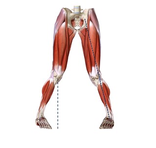 In the correct position shown in the previous diagram we saw that the knee line of gravity was in alignment with the inside of the angled-in foot. In the diagram above, we see this is now a good couple of inches away from the dotted line on the leg to the left. The knee is showing as out of line from the natural line between the ankle and pelvis.